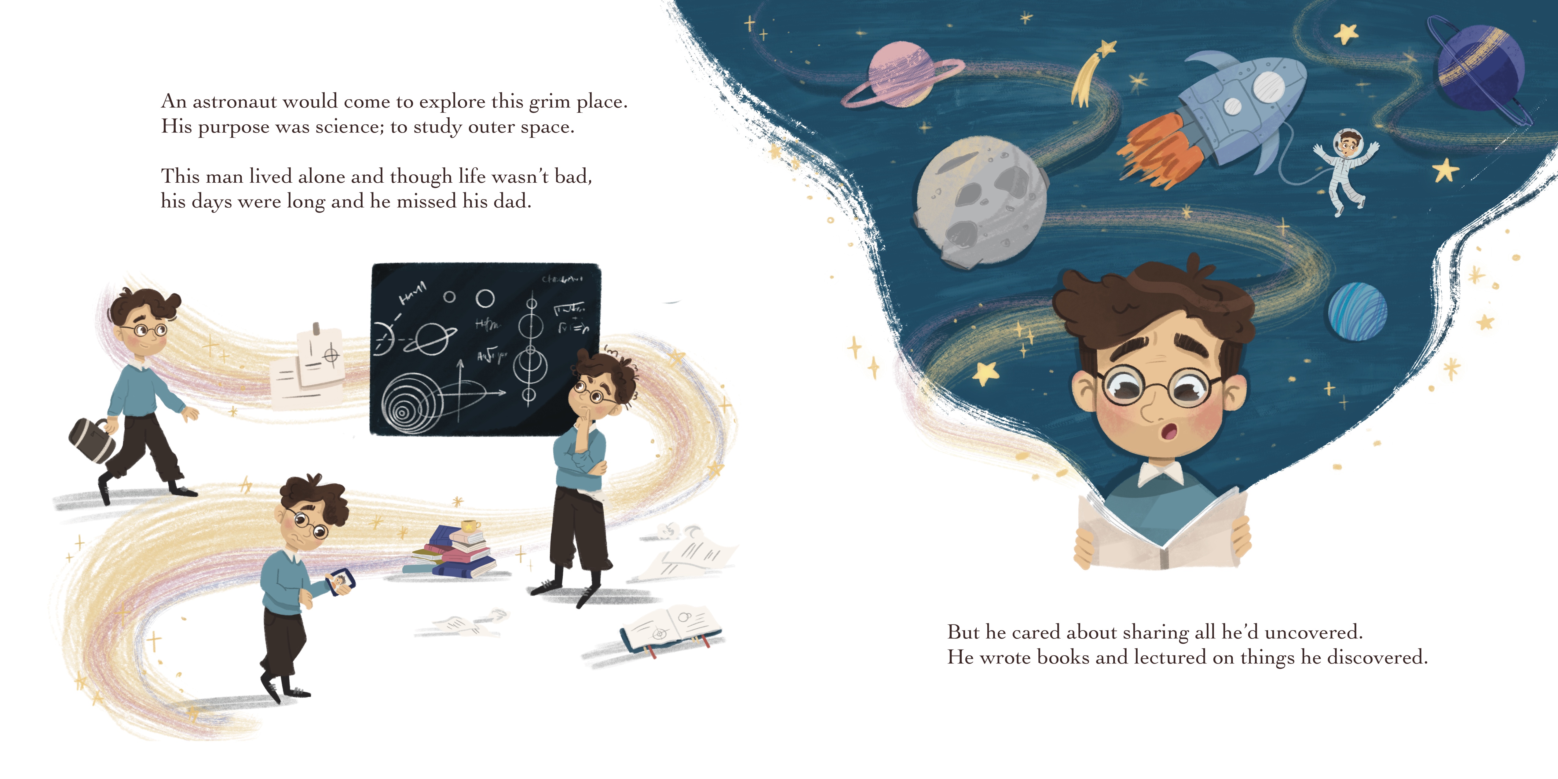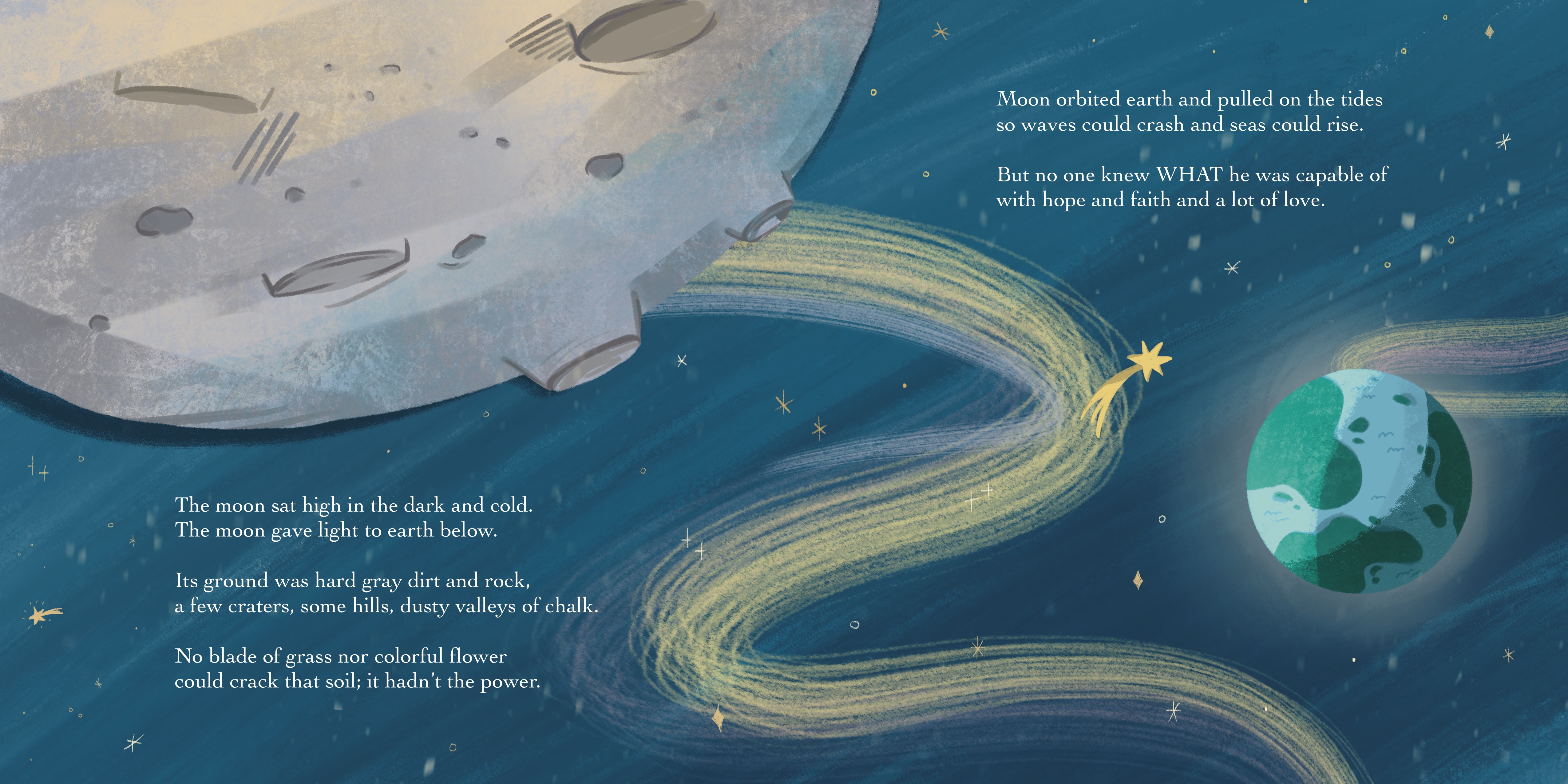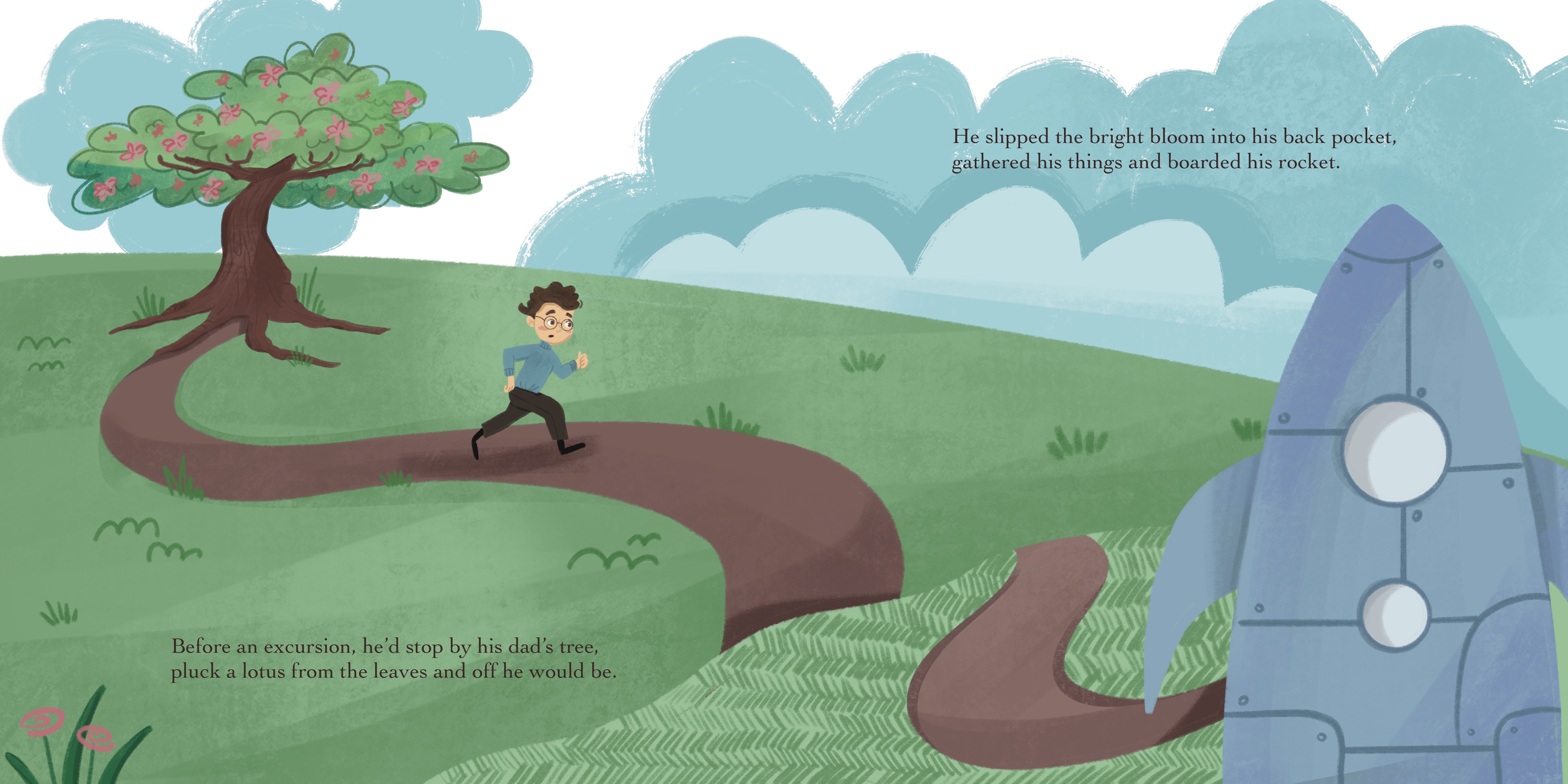 The story is about a young astronaut who goes to the moon; he accidentally drops a flower from his pocket and miraculously a big, beautiful tree grows there. It’s a touching story about loss, perseverance, hope and ultimately, love.
